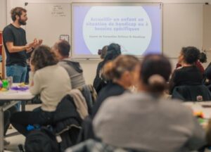 Ce jour-là, les élèves d’une classe de petite section ont déchiré et collé des papiers, soufflé sur des encres colorées ou dessiner des empreintes avec des plaques de mousse pour décorer un papillon en papier.